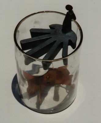 The gravity battery is actually a form of electrochemical cell used to provide a source of electrical power for the telegraph. By the early 20th century, most telegraph lines were powered by motor-generators, however, the gravity battery continued to be used in way stations to power the local circuit. This practice continued at least into the 1950s. The gravity battery used a zinc and a copper electrode. The zinc electrode is seen hanging from the top of the jar. It is often called a "crow's foot" due to its design. A copper electrode is positioned at the bottom of the jar, and is connected to the circuit with an insulated wire. The term "gravity" is used since the solutions of copper sulphate and zinc sulfate have different densities and seperate like a mixture of oil and water. Solid copper sulfate or "bluestone" is added to the copper electrode at the bottom of the cell. The copper sulfate is slowly depleted in use. More copper sulfate is added to refresh the cell.