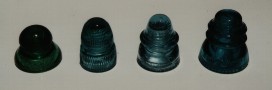 While not a tool per se, the development of the glass insulator was critical to the telegraph's success. The original Morse telegraph line constructed from Baltimore to Washington DC used a buried conductor. When it was found that the line suffered from excessive leakage due to faults in the insulation, it was decided to string the wire overhead using wooden poles. The wire was insulated from the pole by sandwiching it between glass plates. Next a glass doorknob was used. The doorknob was mounted on a wood pin, and the telegraph wire was then attached to the doorknob using a small piece of wire. The modern insulator evolved from this arrangement. It was found that even with the wire touching only the glass, excessive leakage or "escapes" were still a problem. This leakage limited the usable length of the line or even prevented its use in wet weather. Improvements in the design of glass insulators reduced the leakage problem significantly, but they never entirely eliminated it. The most important innovation was the "petticoat" design. The petticoat works as a sort of umbrella, and it keeps a dry path from the wire to ground even when the insulator is rained on. Another innovation was the threaded insulator design. Previous to this, insulators were simply pushed onto a wooden spike. Wind combined with the tension of the wire caused the insulator to pop loose from the wooden spike. The addition of the thread prevented the insulator from popping loose, thus greatly improving the reliability of the telegraph line. The insulators shown from left to right are: A.T.&T. Co., Unknown beehive design (probably Canadian), McLaughlin #19, Hemingray #42.