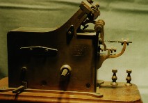 The "register" was the original Morse receiving device. An electromagnet attracts an armature which causes a stylus to emboss a mark in a paper tape. A weight or spring driven mechanism was used to feed the paper tape through the register. The markings on the tape were then interpreted by an operator. The register continued in general use for only a few years. It was soon discovered that operators could simply right down the message by listening to the clicks of the register. This was called "sound reading". It was actually forbidden by some early telegraph companies, as it was believed to be a haphazard way of receiving Morse. Eventually it was proven to be entirely adequate with regards to accuracy. Sound reading was also found to more cost-effective due to the fact that only one operator was required. The register attendant could be fired ! This register was made by G.M. Phelps for the Western Union Telegraph Company. It has a large clock-spring mechanism and a liquid damper to control the speed of the paper feed.