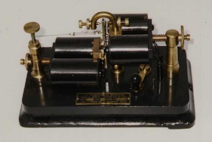The Morse relay was sensitive enough for circuits of two or three hundred miles in length. To extend communications beyond that distance, a repeater was used. A repeater receives weak Morse signals and retransmits the same signals with greatly increased strength. Repeaters are quite complicated due to the requirement of having to send and receive signals in both directions. They usually consist of several specialized relays with multiple magnets and contacts. Many repeater designs were used. The Weiny-Phillips, Milliken, Gheghan, Horton, Neilson, and Toye are examples. This example was made by the Jester-Cooper Company of Houston Texas. It was patented in 1933, making it one of the last Morse repeaters to be designed. This is not the complete repeater system-- at least two other pieces were needed to make a complete repeater.