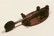 This key is commonly called the "sideswiper". It is operated using a horizontal motion. It has two fixed contacts-- one left and one right. The circuit is closed by moving the lever to the right or left. A rocking motion of the wrist and hand was used to send Morse. This was claimed to reduce the problem with "telegrapher's paralysis" as discussed above for the semiautomatic key. Unfortunately the sideswiper is somewhat difficult to operate. It was marketed by Bunnell beginning in 1888, 16 years before the invention of the semi-automatic key. I do not have any information as to the popularity of this key, however, the sideswiper is a relatively scarce device today. This suggests the sideswiper was not popular with telegraphers. The fact that it was not designed to be portable in a manner similar to the bug may have been one of the reasons it was not popular. This one was made by Bunnell, and it includes the spring tension adjustment patented in 1904. It was referred to as the "double-speed key" by Bunnell. It is missing the circuit closer.