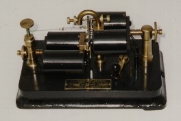 This is a sounder which has its solenoids magnetically biased by a permanent magnet. This causes it to respond to current flowing in one direction only, thus it is "polarized". This type of sounder was used in line test sets in large telegraph offices. It was not normally used for routine communications. This example is a Western Electric model 7A wound to 1000 ohms.