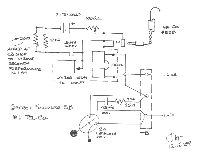 One of the very last of the portable sets was used by Western Union to cover special events. This set is very unique in that it does not use a conventional sounder. Instead, a telephone headset is used to produce the clicking sounds of the Morse code. This was done in the case where a reporting telegrapher would be in close proximity to a speaker, or any situation where a conventional sounder would be a nuisance. An excellent example of this is covered in "The Era of Morse Telegraphy" by Arthur Grumbine. Arthur covered a speech by President Roosevelt. Art's photo clearly shows several of the special events sets in use.