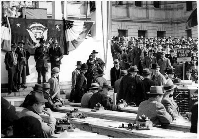 | View of Western Union Press set-up to cover speech by President Franklin D. Roosevelt Oct 29, 1936, from the steps of the Capitol Building at Harrisburg, Pa. The photo was taken by Arthur Grumbine, whose Morse position is clearly visible in the lower-right-hand part of the picture. 6 of the special events sets can be seen in this photo. |