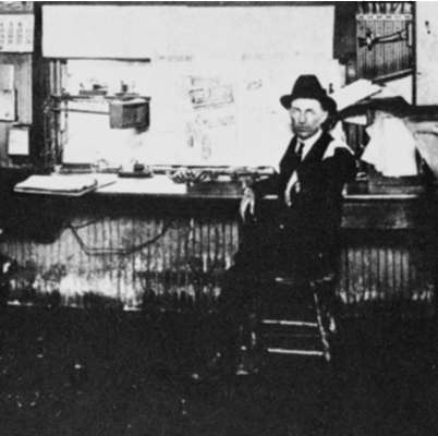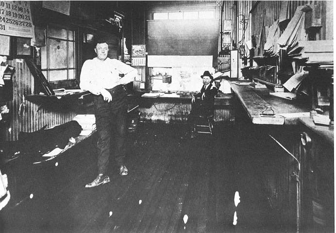 Telegraph office from the movie "Union Pacific". Note locomotive headlight in the background. Also note mainline battery on the table behind the operator. |