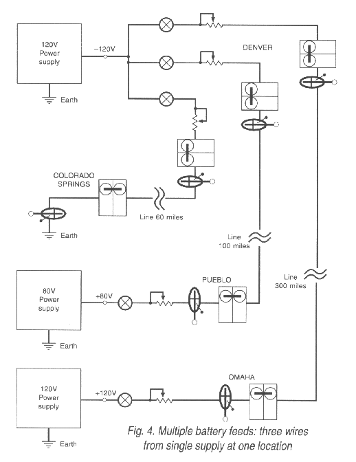 1. For reasons explained in a previous article (‘Observations on Telegraph Instrument Use in Circuit’) adequate voltage must be supplied in order for the instruments to operate properly, particularly if high resistance 100, 120 or 150 ohm mainline instruments are to be used. The 'open circuit' voltage is the supply voltage such as would be measured in the circuit across an open key with a DC voltmeter. For circuits with more than two mainline instruments in circuit, this voltage should be not less an 100 volts in order to obtain proper operation and ease of adjustment of the sounders or relays. Lower voltages can used but performance will suffer if too many instruments are cut into a circuit with insufficient supply voltage, regardless of the operating current value.