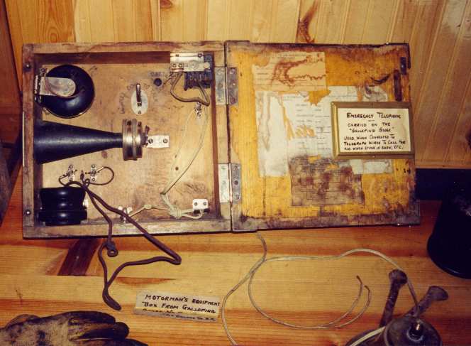 I have little information on telephone equipment. I do know that there were two types of telephones used. The "telegraphone" was designed to be used on telegraph lines. In fact, it was possible to operate both telegraph and telephone simulataneously on the same wire. This is due to the fact that telegraph signals are very low frequency, while telephone voice is higher in frequency. Thus the two types of signalling can be kept seperate using electrical filters. Telegraph lines use only a single wire in combination with the earth to form a closed electrical circuit. This is a disadvantage for telephone circuits, as they will be susceptible to electrical noise from adjacent circuits on the same pole line, electrical motors, power lines, etc. Thus the telegraphone was probably quite noisy and usable only in remote areas such as those found on the narrow gauge.